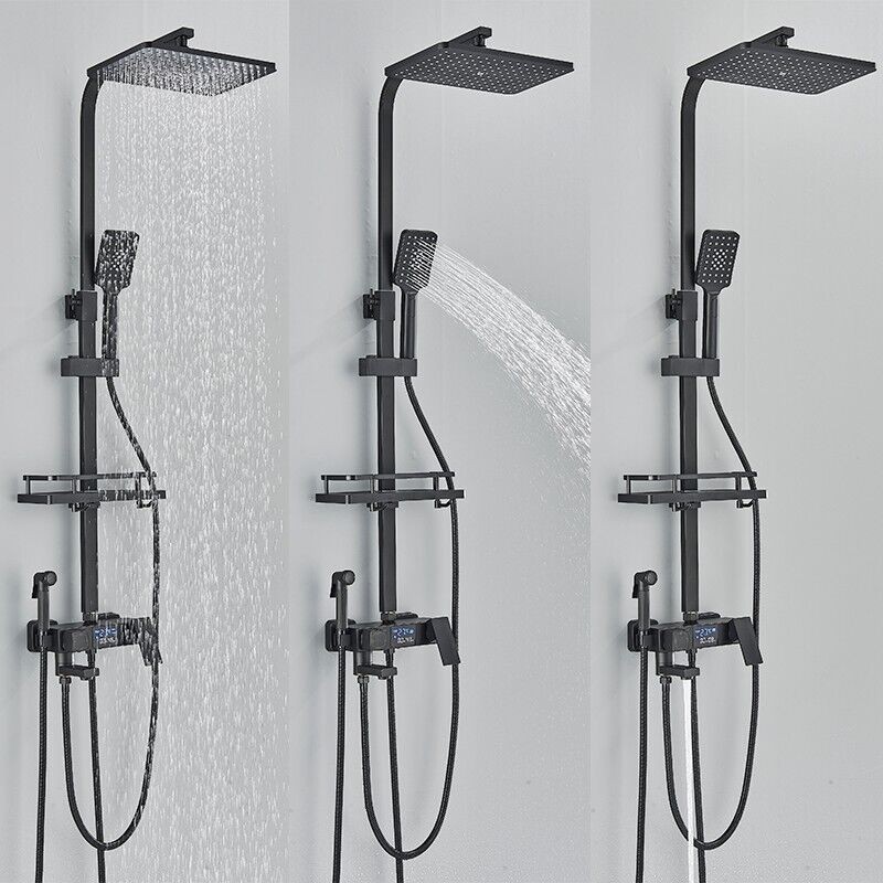 Modern Exposed Black Shower Mixer Twin Head Bar Set Bathroom Square Valve Tap