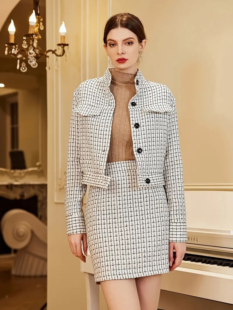 Plaid Button Textured Blazer, Open Front Long Sleeve Suit Jacket With Wide Lapels, Elegant & Stylish Tops For Office & Work, Women's Clothing & Outerwear