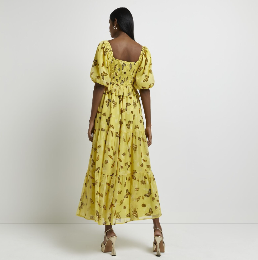 River Island Womens Maxi Dress Yellow Print Cut Out Stylish Short Sleeves