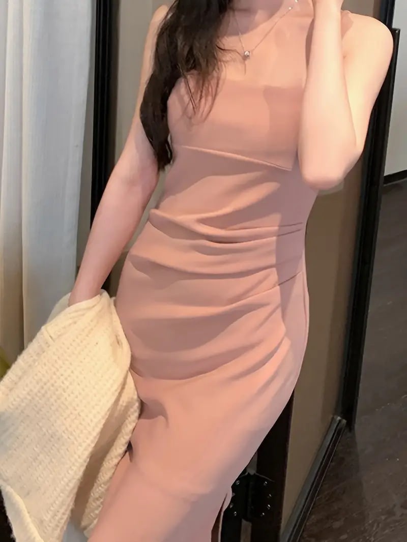 Solid Pleated Split Hem Tank Dress, Elegant Sleeveless Square Neck Dress For Spring & Summer, Women's Clothing