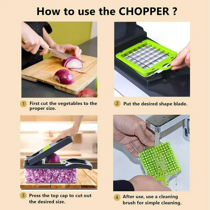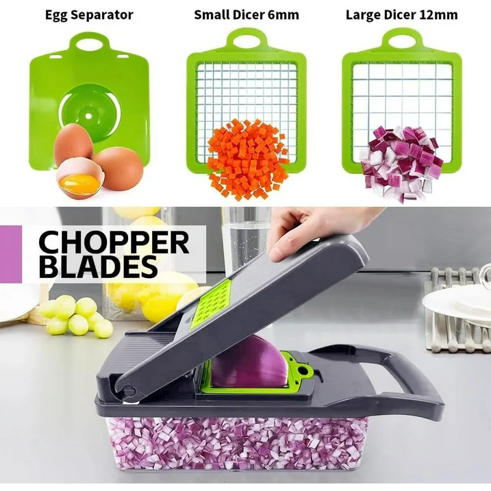 ⭐【Professional 12 in 1 Vegetable Chopper】Multi-Functional & Easy to use vegetable chopper with 7 interchangeable blades through which you can get big or small, thick or thin slices, shreds or Julienne. Press the food chopper lid to cut food directly into onion chopper with container.