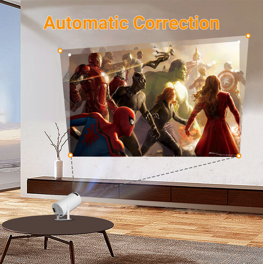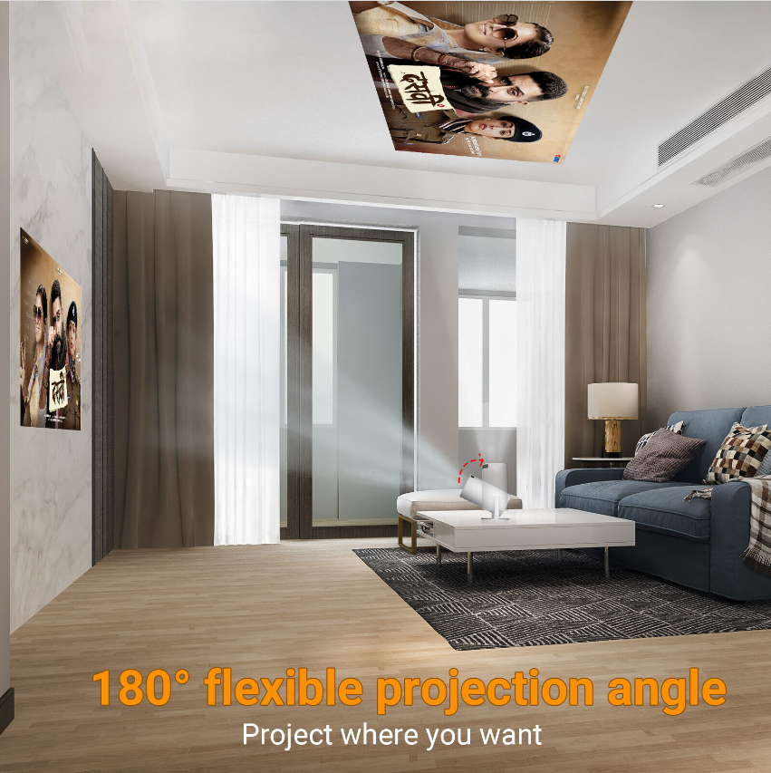 Adjustable 180° projection angle, allowing you to rotate it to any angle to play video or picture. Supporting automatic correction and manual focus.